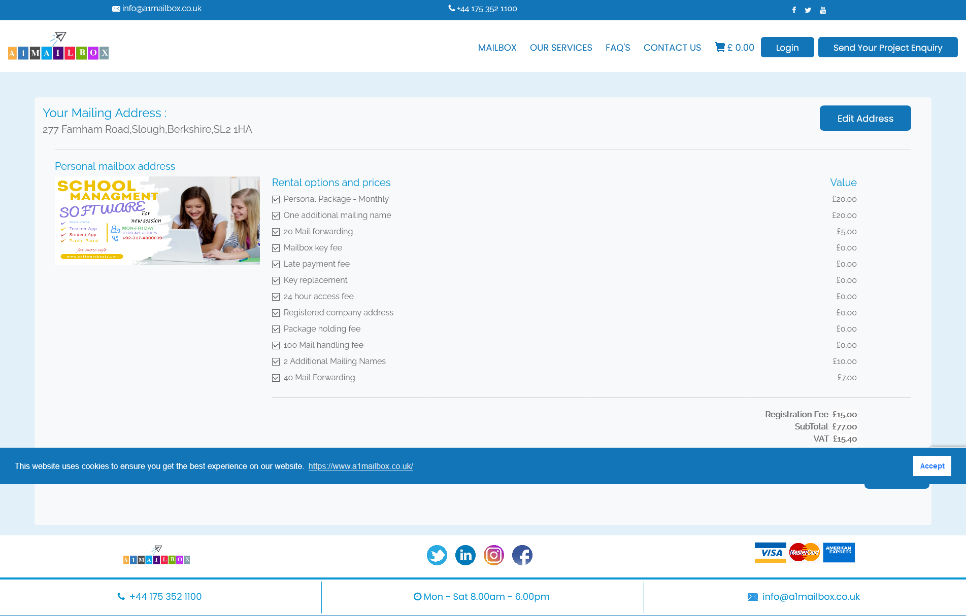 A1 Mailbox allows users to subscribe to the package they want. Providing different mailing options, users just have to check the box and the amount of each service is added to his payments. A1 provides full control to the owner of the system to change the information regarding its customers.